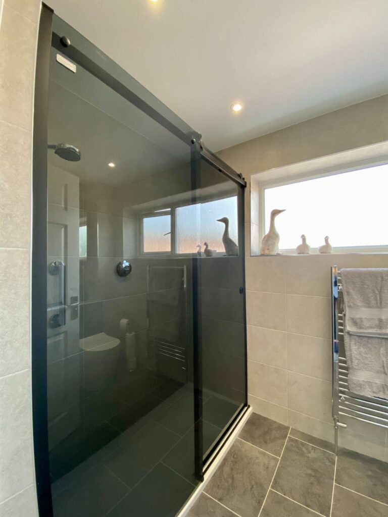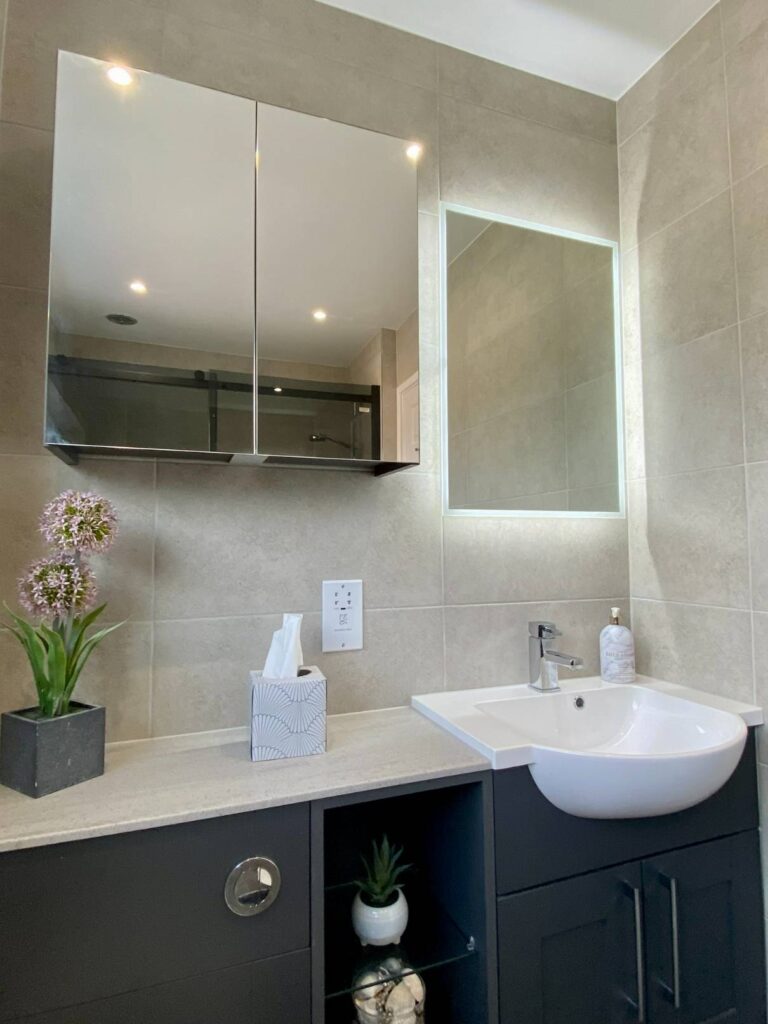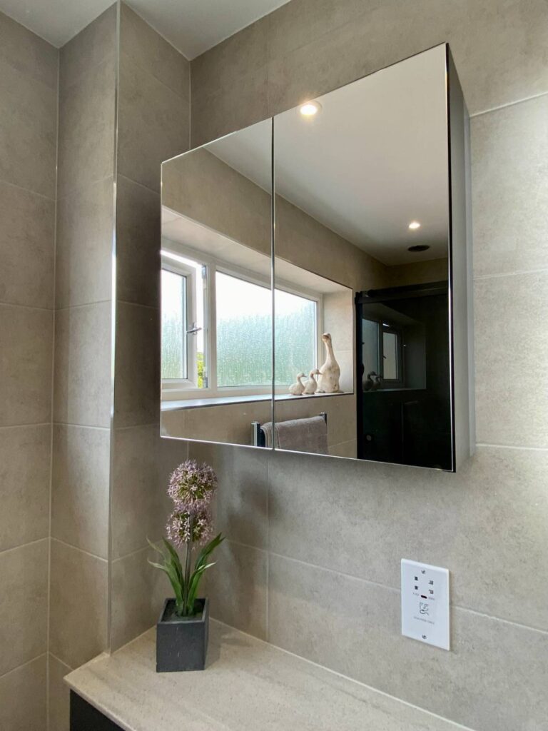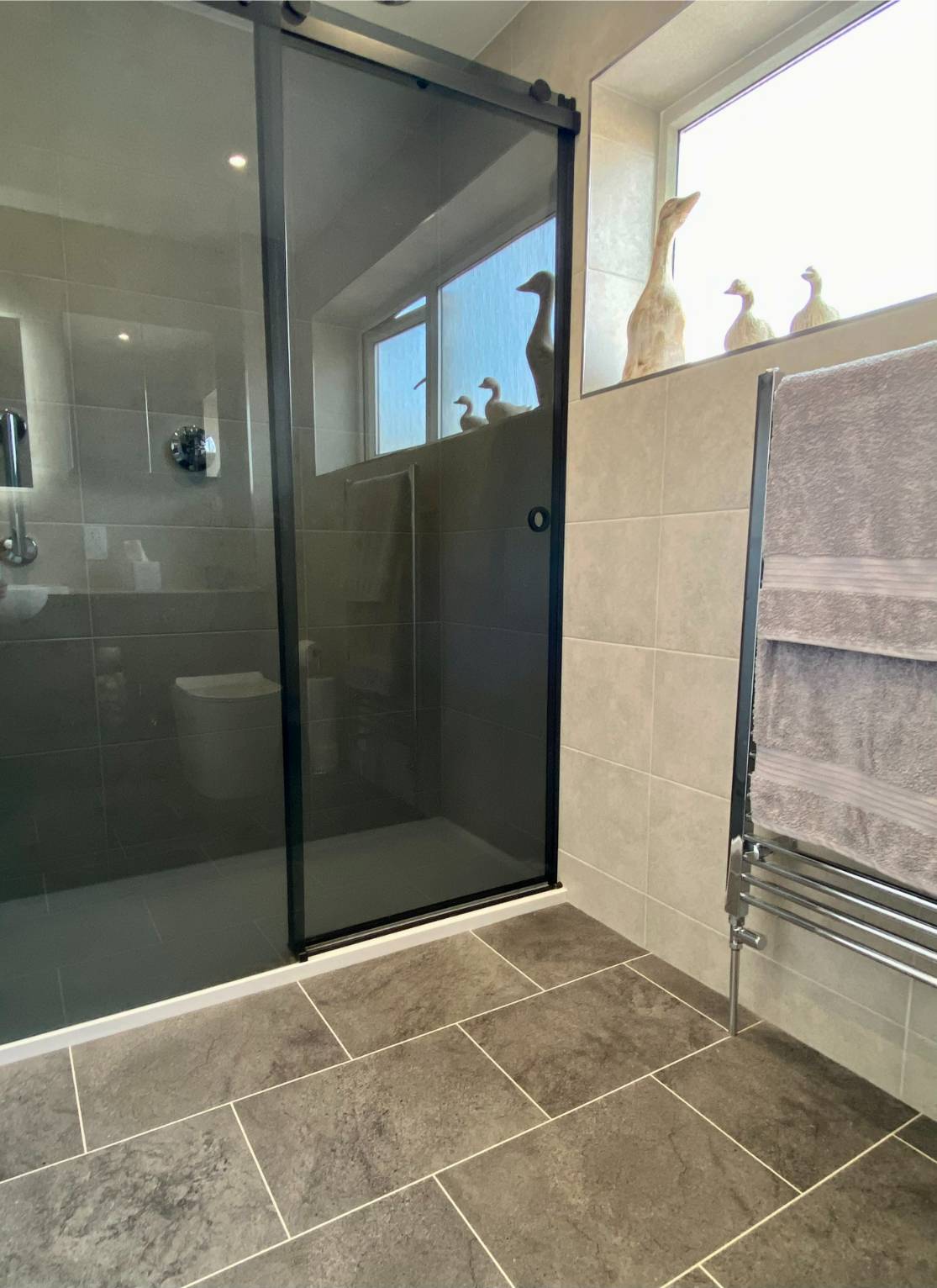 ”I recently had our bathroom redesigned by Bedroom & Bathroom Creators and it is fabulous. A large shower has been installed where the bath used to be, giving easy access for me, with beautiful smoky glass sliding doors. The toilet and washbasin area is perfectly designed with plenty of storage space. It was completed on schedule to a very high standard. All the furniture is very well made and the fitters were wonderful. The bathroom was project managed from start to finish by Jason, including design, plastering, electrics, fitting and tiling. Thank you, we are delighted with our new bathroom.
