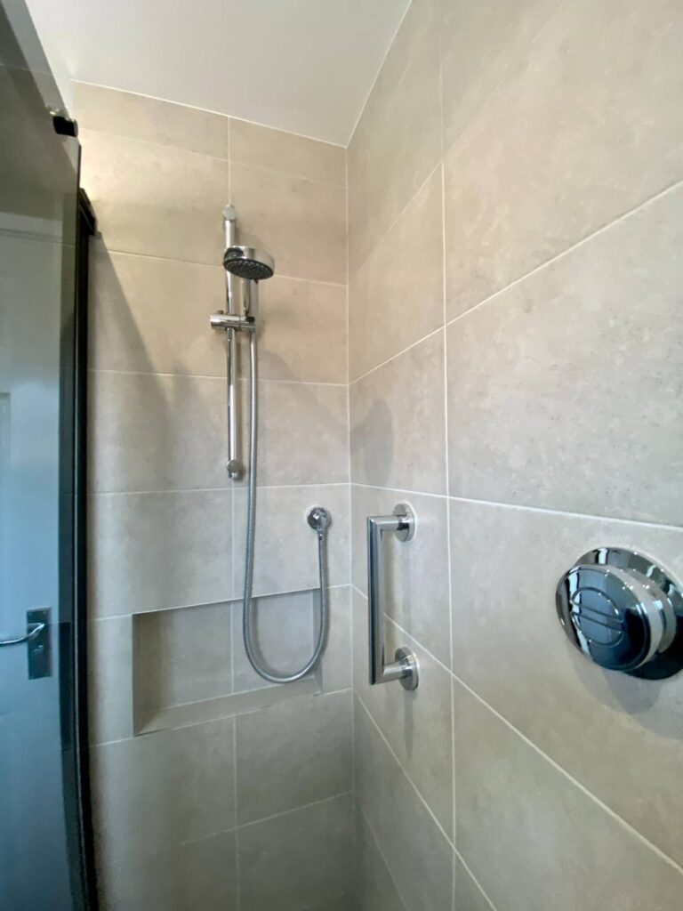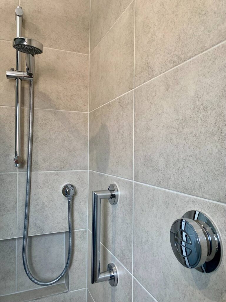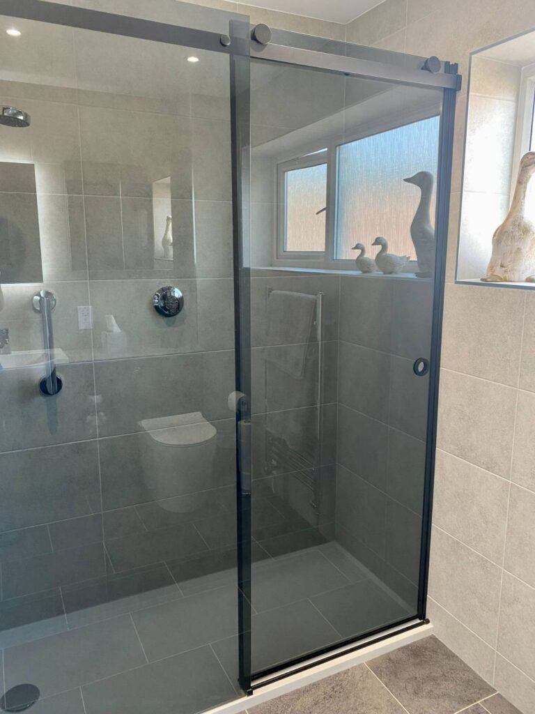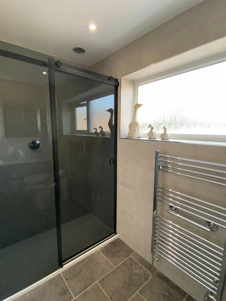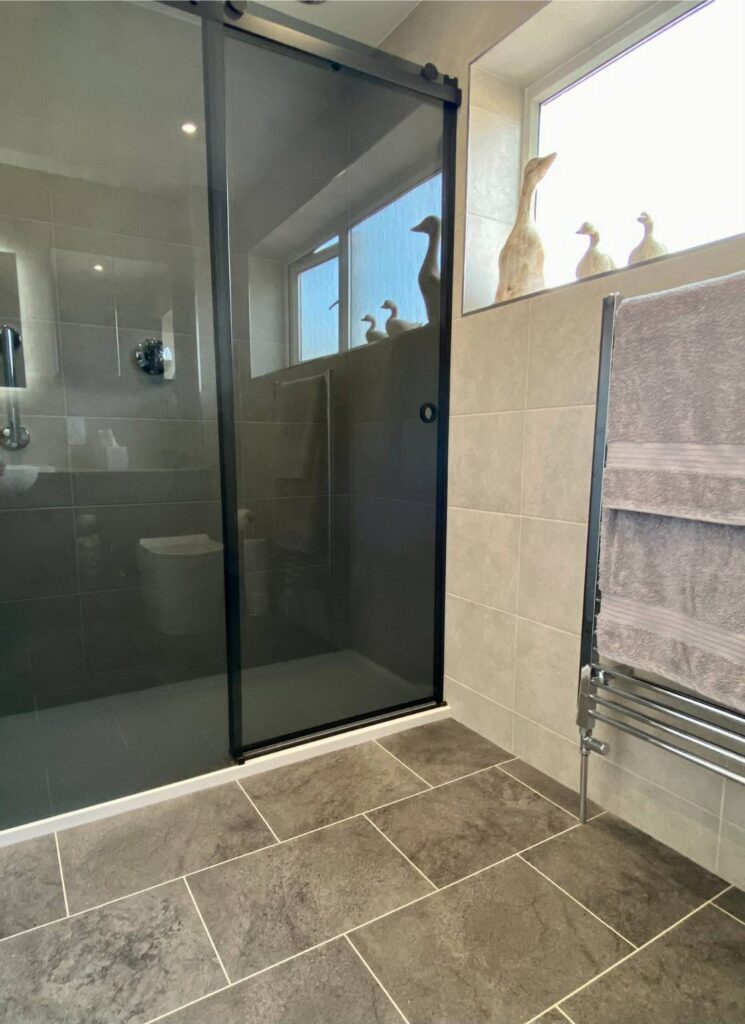 ”I recently had our bathroom redesigned by Bedroom & Bathroom Creators and it is fabulous. A large shower has been installed where the bath used to be, giving easy access for me, with beautiful smoky glass sliding doors. The toilet and washbasin area is perfectly designed with plenty of storage space. It was completed on schedule to a very high standard. All the furniture is very well made and the fitters were wonderful. The bathroom was project managed from start to finish by Jason, including design, plastering, electrics, fitting and tiling. Thank you, we are delighted with our new bathroom.